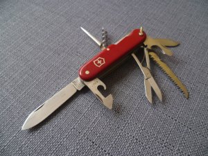 (február 2015): Po viacerých pracovných a armádnych nožoch sa mi konečne podarilo rozšíriť aj zostavu dôstojníckych (officier’s) nožov o pekný exemplár. Ide o štvorvrstvovú Victoriu (Victorinox) model Huntsman. Nôž je vo veľmi peknom stave, pochádza z obdobia 1951-1961. Je to jasne definované tvarmi oboch otvarákov. Vo veľmi dobrom stave sú všetky nástroje – napríklad nožnice majú dokonca pôvodnú pružinu. Nôž má veľký záves (shackle), pílku s nechetníkom, starý typ šidla, či viditeľné nýty. To sú všetko znaky výroby z obdobia pred rokom 1961. Rok 1961 bol u Victorinoxu prelomovým rokom – nielen, že sa u dôstojníckych nožov sa začali používať skryté nýty, nové tvary otvarákov a šidla, ale zároveň sa objavil aj revolučný armádny hliníkový model 1961. Nôž má na rikase klasické značenie Victorinox Switzerland Stainless Rostfrei a na druhej strane nápis Victoria Officier Suisse na znaku kuše. Na čepeli je ešte reklamný nápis K. Eberle, Zűrich. Meno Eberle sa spája s mnohými firmami vo Švajčiarsku (zdroj: https://www.moneyhouse.ch/), takže tažko vydedukovať, o ktorú firmu šlo. V porovnaní so starším nožom (1946-1951) je nôž výrazne subtílnejší, nástroje sú tenšie, jemnejšie opracované. Proporciami sa už skôr podobá na generáciu po roku 1961.