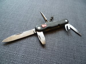 (máj 2013): Do zbierky sa mi dostal ďalší "dôstojnícky" nôž od Wengera, veľmi podobný nožu s označením Tahara. Konštrukčne sú tieto nože identické, hlavný rozdiel je v tom, že tento exemplár nemá otvarák na flaše, ale veľký plochý skrutkovač. Z toho by sa dalo vyvodiť, že ide o starší kus ako Tahara. Tieto skrutkovače sa na nožoch Wenger aj Victorinox objavovali zhruba do konca 30.rokov. Ďalší rozdiel je v materiále príložiek, ktorým na tomto noži nie je mosadz, ale oceľ. Črienky sú z vulkanfíbru, ale netypycky čiernej farby. Do črienky je vložený plastový znak, ktorý určite nie je pôvodný, ale si ho tam podomácky nainštaloval niektorý majiteľ. Na hlavnej aj malej čepeli je vyrazený starší znak Wengeru pozostávajúci z troch tvárí vyobrazených z profilu a spojených do trojuholníkového obrazca. Označenie výrobcu pozostáva z nápisov Wenger a Delémont. Nástroje sú z uhlíkovej ocele, sú v dobrom stave, pekne pôsobí najmä dlhá a štíhla hlavná čepel, ktorá má vďaka krátkemu rikasu veľmi dlhé ostrie.