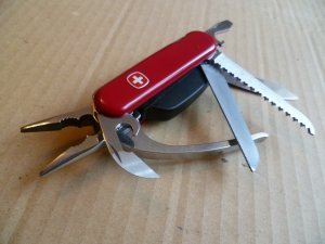 (apríl 2011 - február 2014): Predstavím vám zaujímavý, ale trochu nevydarený model. Wenger PocketGrip by mal byť vreckový nôž s kliešťami. V skutočnosti ide skôr o kliešte s viacúčelovým nožom integrovaným v jednej rukoväti. Podľa sakwiki.com sa vyrábal v rokoch 1998 až 2010. Pozrime sa teraz, čo všetko tento model ponúka. V prvom rade sú tu plnohodnotné kliešte, ktoré obsahujú všetky funkcie ako klasické kombinačky. Kliešte sa zaisťujú v zatvorenej polohe poistkou na chrbáte noža. Ďalej je tu čepel (oproti nej nie je nič), pílka na drevo, pílka na kov s pilníkom a bežná vrstva s otvarákmi. Na chrbáte je šidlo a nosič bitov, ktorý je magneticky uchytený v mieste, kde býva vývrtka. Pod rukoväťou klieští, ktorá sa otvára je plastové púzdro, ktoré obsahuje tri ploché a tri krížové skrutkovače. Ich nasadenie prebieha nasledovne: spomínaný držiak, ktorý je v mieste vývrtky, sa nasadí do otvoru, ktorý je pri plastovom púzdre a do neho sa nasadí vybraný skrutkovací nástavec. Otázne je, koľko by vydržal uvedený otvor, keďže je vyformovaný len z plastu. Nôž je dosť hrubý (27 mm) a hlavne ťažký - váži 211 g, čo je o 25 g viac ako Swisschamp! K nožu je ale štandardne nylonové púzdro. Osobne by som uvítal redukčnú úpravu: vynechal by som pílky aj otvaráky, čiže okrem klieští, čepele a nástavcov, by tam nebolo nič iné. Klesla by tým hmotnosť a stúpla použiteľnosť. Prednosťou modelu PocketGrip sú hlavne mohutné kliešte, ktoré sa nedajú porovnávať s malými kliešťami Wengeru aj Victorinoxu. Na druhú stranu zase vyčnievajú z obrysu noža, ktorý sa tým pádom na nôž už ani nepodobá.